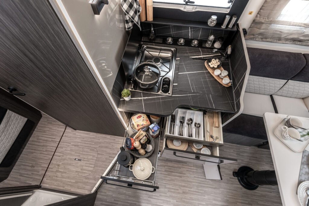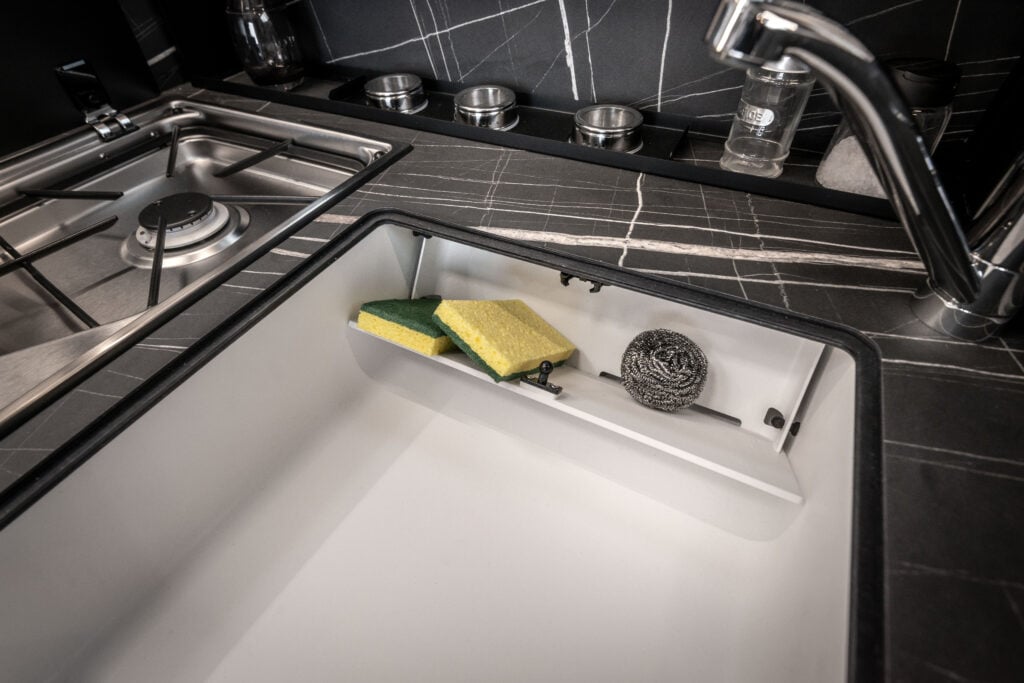 The kitchen combines style and functionality in a well-designed and perfectly organized space. The premium 2-burner hoband sink with invisible drain and integrated sponge holder ensure practicality and comfort while traveling. The large storage compartments, including wall cabinets with shelves, soft-close baskets, and internal drawers, allow you to keep utensils and supplies tidy at all times.