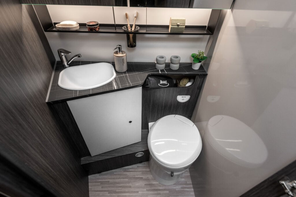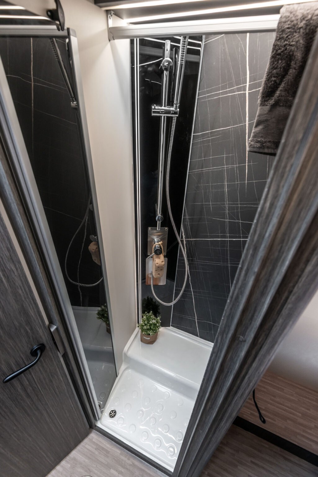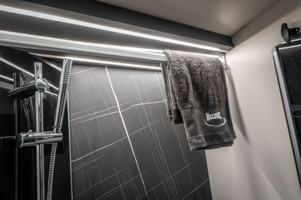The bathroom is designed to ensure maximum comfort, practicality, and privacy during every journey. The porthole window naturally illuminates the space and promotes proper ventilation, keeping the area cool and bright. The large walk-in shower ensures freedom of movement and ease of use on every occasion, even during the shortest stops.