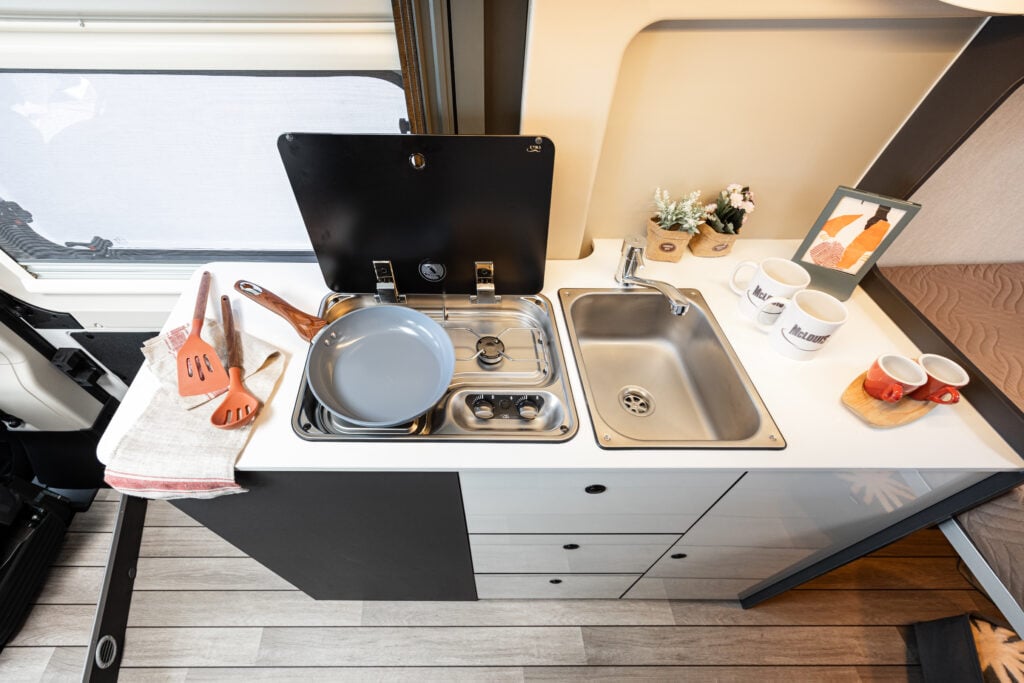 The linear kitchen in Menfys vans is designed to offer maximum practicality, with a two-burner hob and steel sink equipped with a mixer tap, for a home-like experience even when traveling.